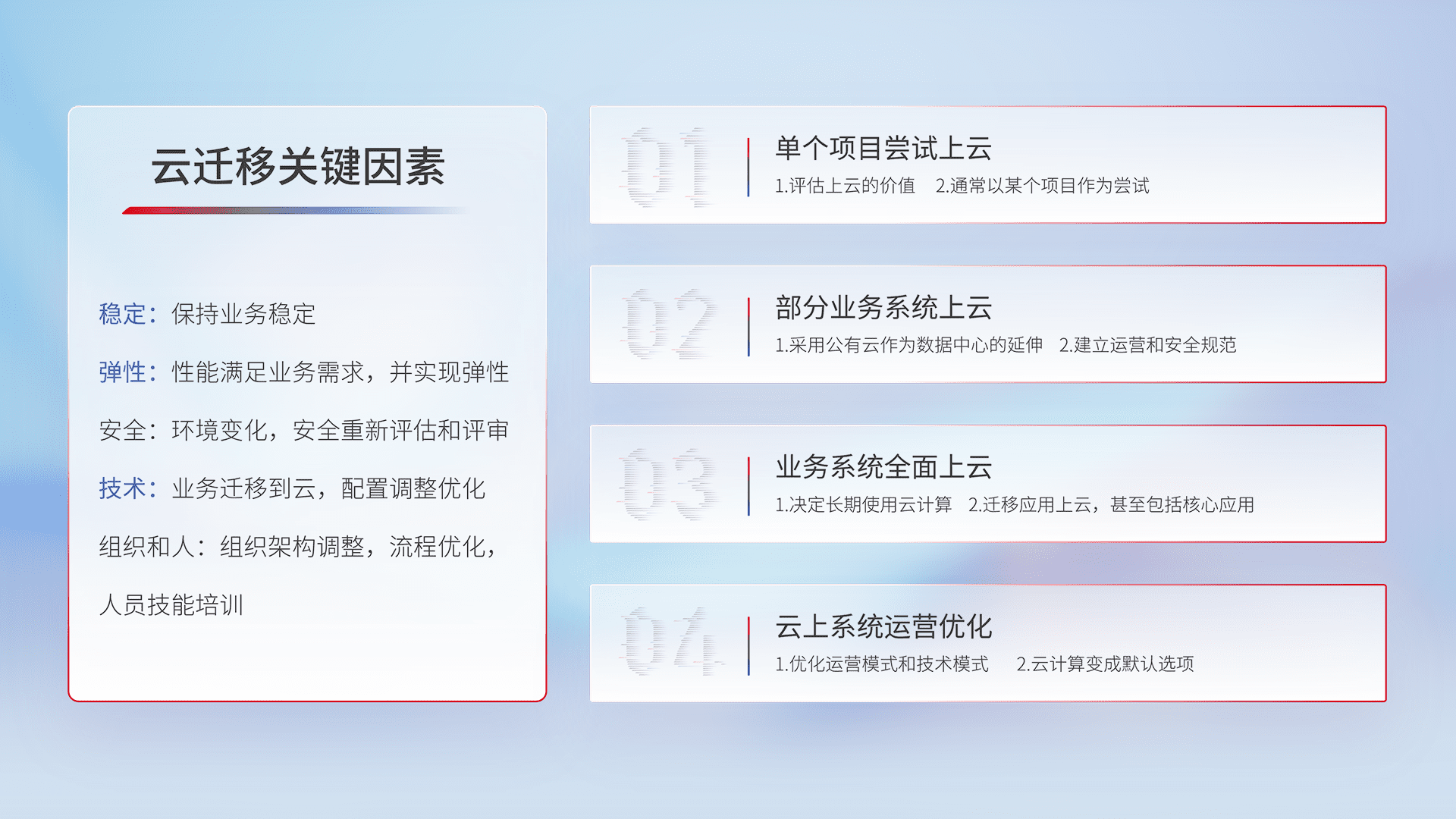 结合实际业务,,从规划设计、、云平台选型、、、云原生改造、、、、数据迁移、、、集成交付,,,迁移全过程为客户识别最佳上云路径,,做好风险识别管理,,,设计网络架构、、身份权限、、安全审计合规、、、操作审计、、、、日志审计、、、监控告警策略、、、多站点容灾设计等,,,,对云上基础设施进行整体规划,,,,提升IT治理水平,,,以满足弹性、、高可用、、高性能的需求。。。