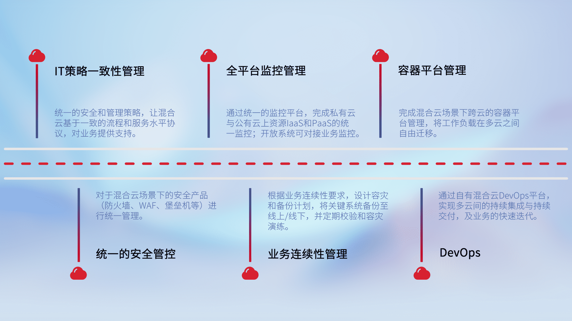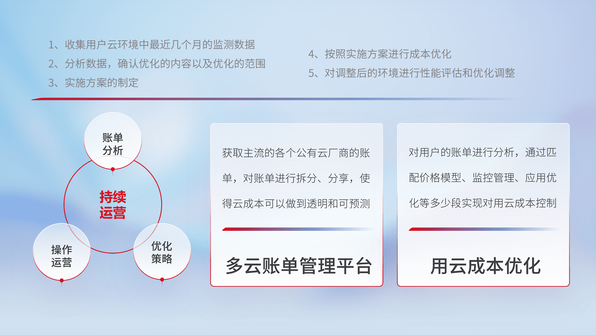 通过多云纳管,,,,以统一的资源数据模型把客户的云资源进行抽象和封装,,进而实现对多云资源的统一操作,,保障云资源管理的可靠性、、稳定性与可用性。。。量身定制化运维内容,,配置、、、开发运维、、、补丁管理、、、备份、、监控、、、、认证和访问管理、、审计和日常巡检等,,保障在用云过程中的可靠度,,,,稳定度以及高可用率。。。。